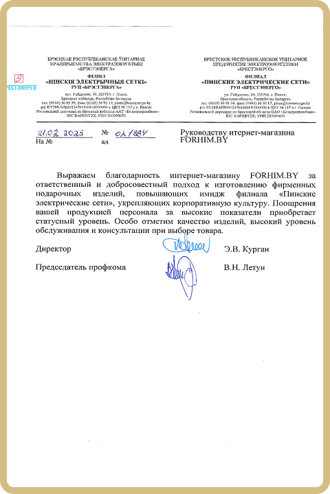 Компания FORHIM.BY изготовила серию брендированных подарков для сотрудников «Пинских электрических сетей» (РУП «Брестэнерго»).